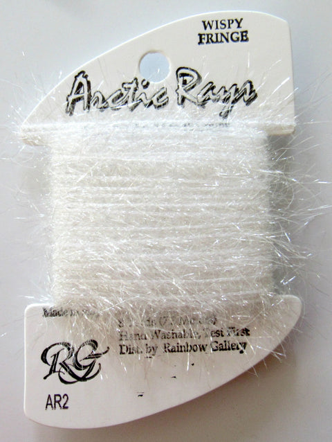 Arctic Rays is certainly a unique fiber. Just from first glance you can see this thread is different from anything else you'll find to stitch with!Take a look at the photo above. You will see that Arctic Rays is covered with long lengths of wispy fringe. Unlike many other fuzzy threads Arctic Rays is made of 100% Nylon in Italy. Because it is a synthetic fiber it comes in incredible and bright colors. Because of the long wisps on the thread, Arctic Rays should be one of the last threads you add to your project. This is because you don't want to run the risk of pulling the threads into other sections of your stitching. We also recommend working with shorter lengths of this thread. (8-10 inches for example). But where would you want to use it on a canvas? Think flowers, hair, beards, grass, scarves or even fur. The glistening effect of this yarn is more pronounced with long stitches, as less of the fringe is pulled into the canvas.