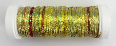 Shimmer Floss is a braided ribbon with a combination of rayon and metallic fibers approximately 1/8" wide. As it is stitched it can be laid flat or simply stitched. Use as a single thread in lengths of 24" or less.