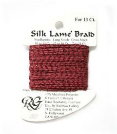 Silk Lame A mix of silk and metallic together give your design a wonderful sparkle. You can use it as is off the card for stitching, no plying necessary. 18 count contains four strands of silk and four metallic filaments braided together. 13 count is a blend of eight strands of silk and eight metallic filaments. Makes a beautiful twisted cord and tassel for finishing.