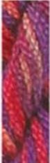 Hand-dyed 12 ply spun silk. 6 yard skeins. Easily divided, it fits beautifully on many fabric and canvas sizes. Four plies work well on 18 count canvas, two plies cover 18 count fabric for cross stitch. Also use two plies for cross stitch over two threads on 28 count fabric. Good for surface embellishment on quilts. 6 yard skein.
